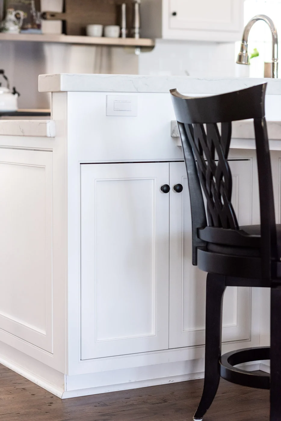 Transitional Country Cottage style kitchen with white painted cabinets and custom pantry storage